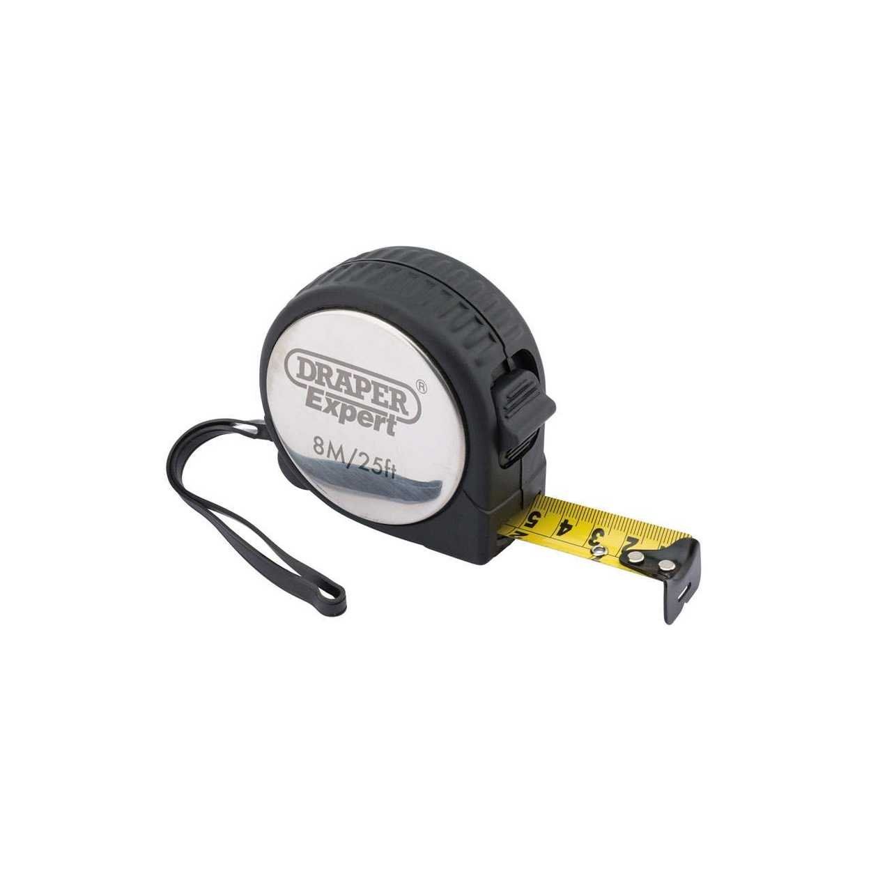 Made with a hardwearing stainless steel case attached with a soft grip for user comfort. Fitted with a large blade-locking button and belt clip. The nylon-coated blade has clear black and red metric and imperial graduations, metres into cm/mm and feet into inches, 1/8" and 1/16" on both sides and obvious stud centre markings every 16" all coated in a hardwearing yellow protective cover. The self-aligning end hook assists in providing extremely accurate internal and external measurements.