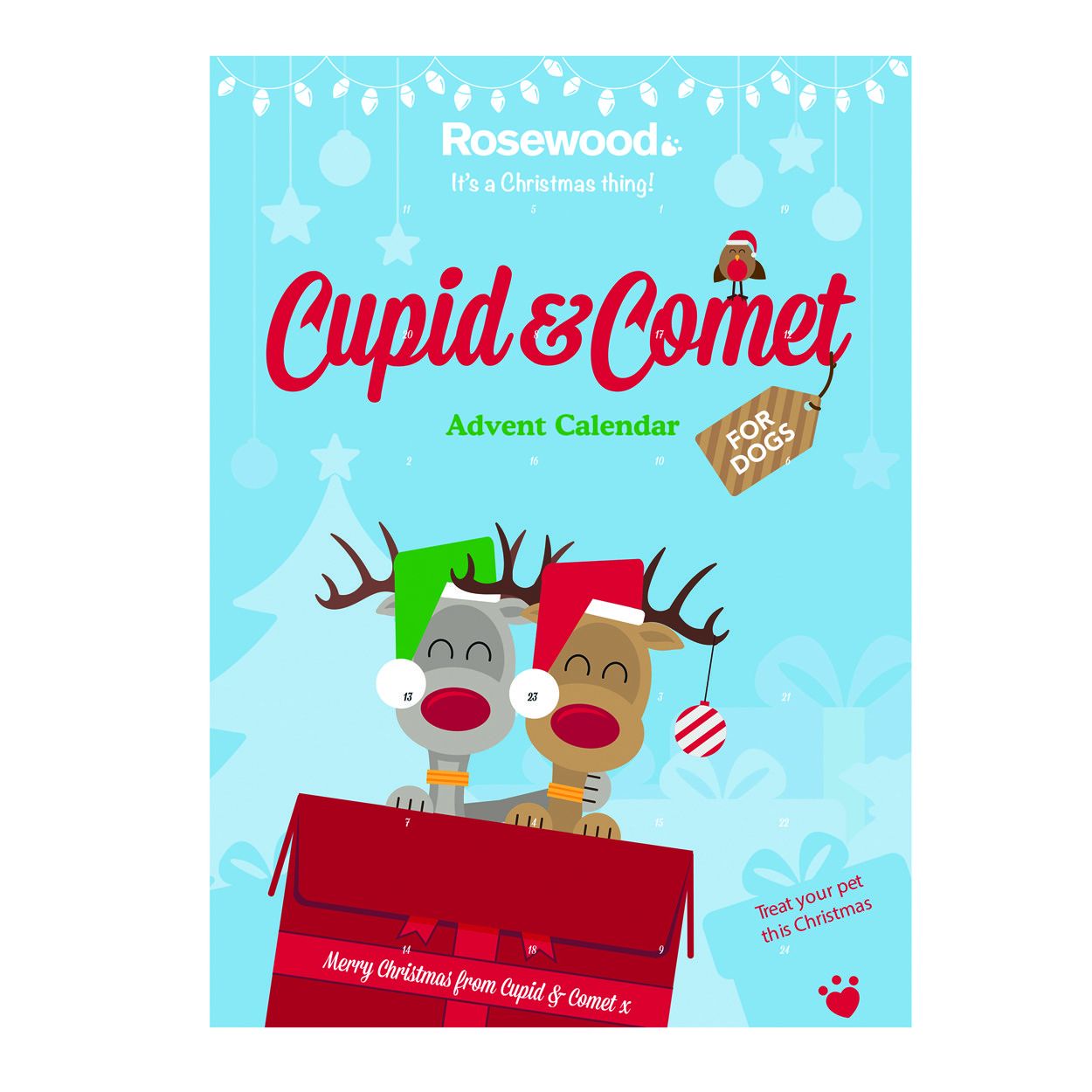 Advent Calendar of Treats for Dogs. Each Window Contains a delicious Carob Treat inside. Attractive colour Christmas packaging featuring Cupid And Comet Brussel Sprouts for Dogs