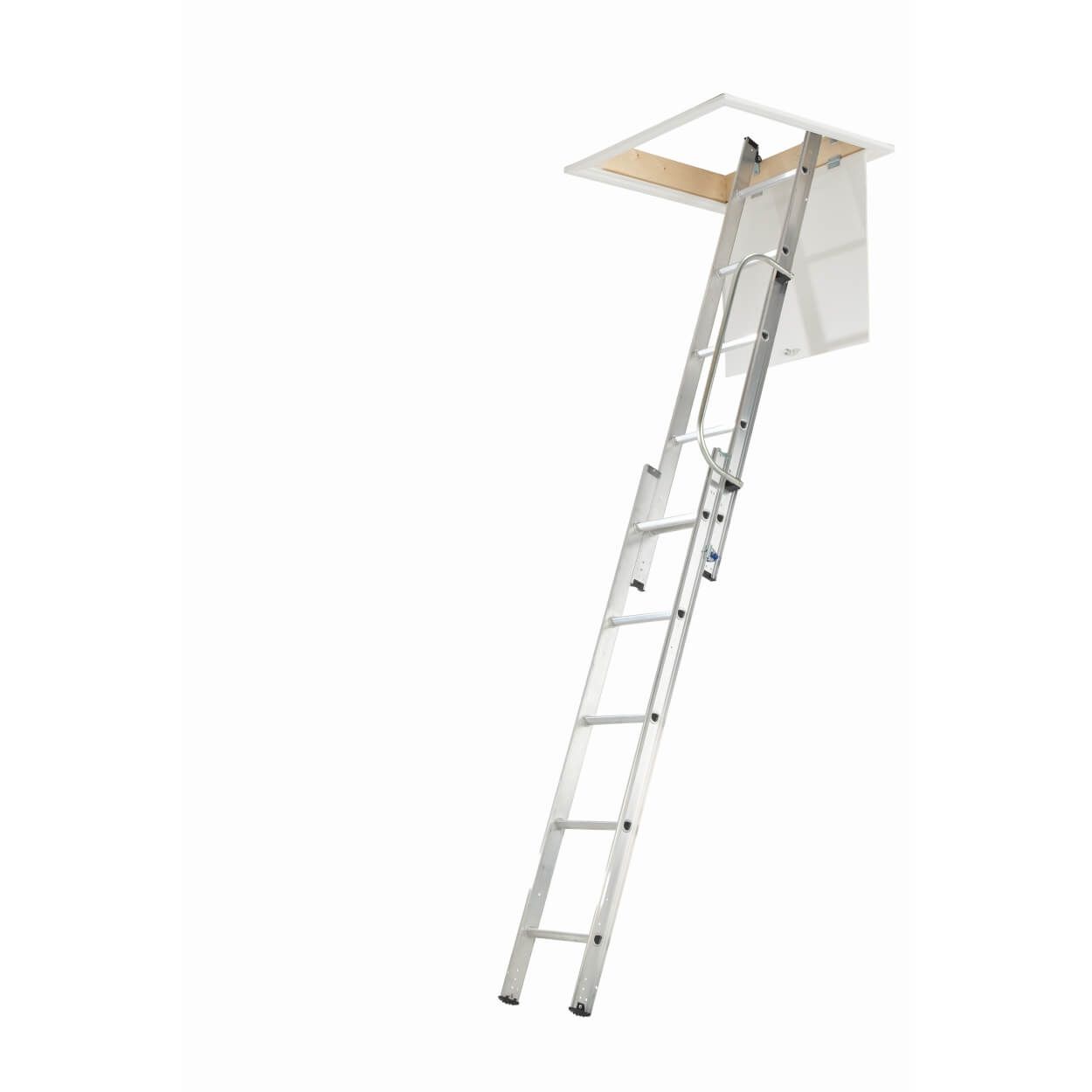 This sturdy and practical aluminium loft ladder is a perfect loft-access solution, extending from two overlapping sections that can be affixed to the inside of the loft to be lowered down when access is needed. Measuring (H)163�(W)30.5cm, this ladder has all the components needed for DIY installation, including a universal stowing pole and comprehensive instructions � it also has 'D' shaped rungs, for added comfort and security. Suitable for heights up to 2.69m
