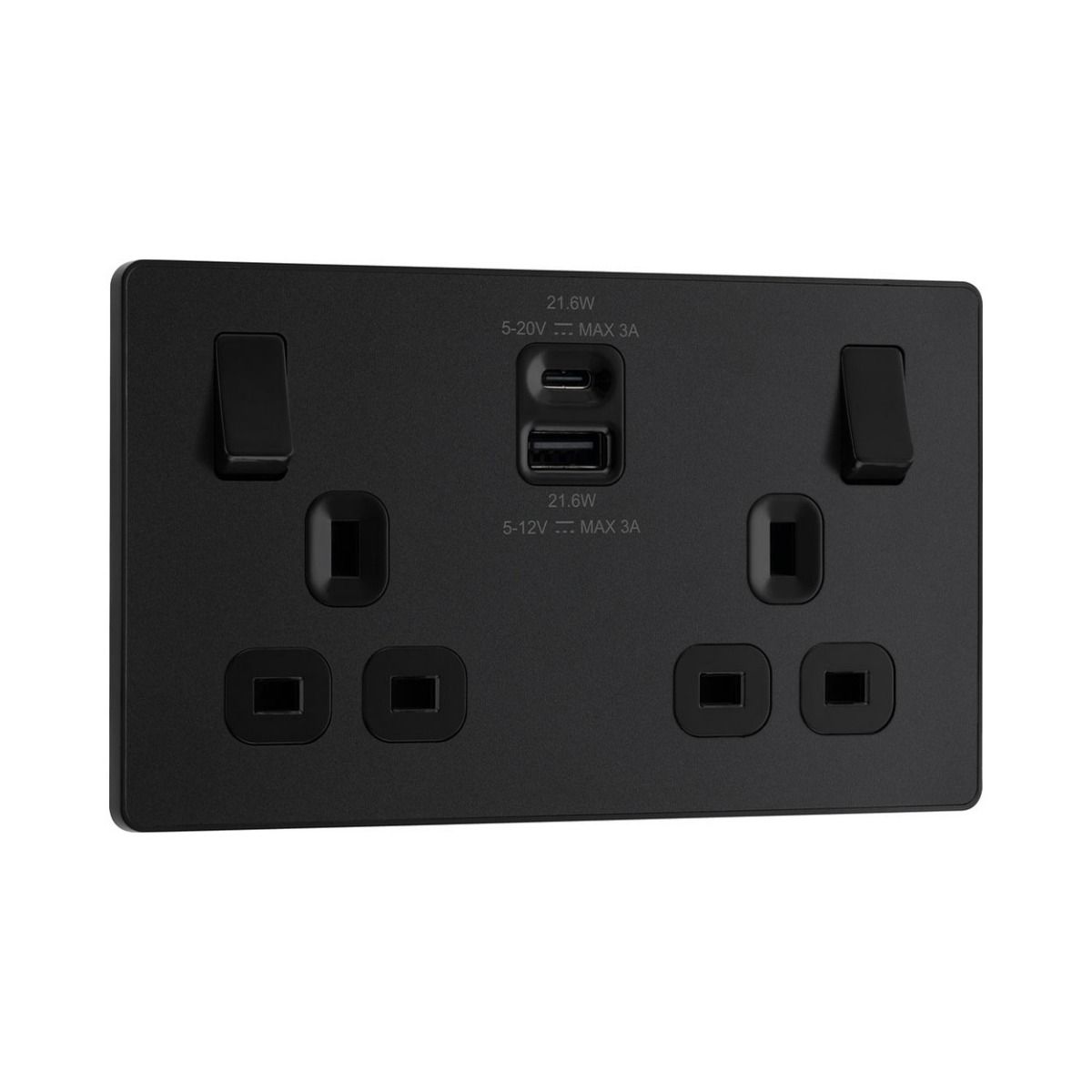97624Bg Evolve Matt Black 22W Double Usb Socket A+Chttps://www.woodies.ie/media/catalog/product/cache/f1b65b6de91aaa688d3d65a5114607a9/1/2/1232178.jpg123217834.99EURInStock/DIY & Building Materials/DIY & Building Materials/Electrical/DIY & Building Materials/Electrical/Switches & Sockets13A socket with fast charge USB A and C ports 22W variable voltage fast charging supports PD and QC protocols for Android and iOS devices Designed with angled in line colour coded terminals and backed out captive screws for ease of installation The Evolve range features a low profile screwless flat plate that clips on and off, making it ideal for modern interiors. falsetruehttps://www.woodies.ie/media/catalog/product/cache/74c1057f7991b4edb2bc7bdaa94de933/1/2/1232178.jpghttps://www.woodies.ie/media/catalog/product/cache/74c1057f7991b4edb2bc7bdaa94de933/1/2/1232178.jpgSimpleProduct