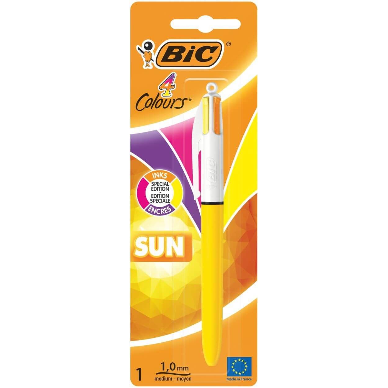 The bright and cheery version of the famous BIC 4 Colours pen. The BIC 4 Colours Sun ballpoint pen in this single pack contains 4 extraordinary ink colours:�pink, purple, orange, and yellow for radiantly unique writing. it's perfect for underlining and circling key ideas and concepts. The BIC 4 Colours Sun pen is the best choice for adding a touch of fun to your writing, emphasising the main ideas and creating bullet journals. Each cartridge has a medium 1.0 mm point that�s great for all types of uses. Pick the one you need with a quick click and let the ideas flow onto the page.