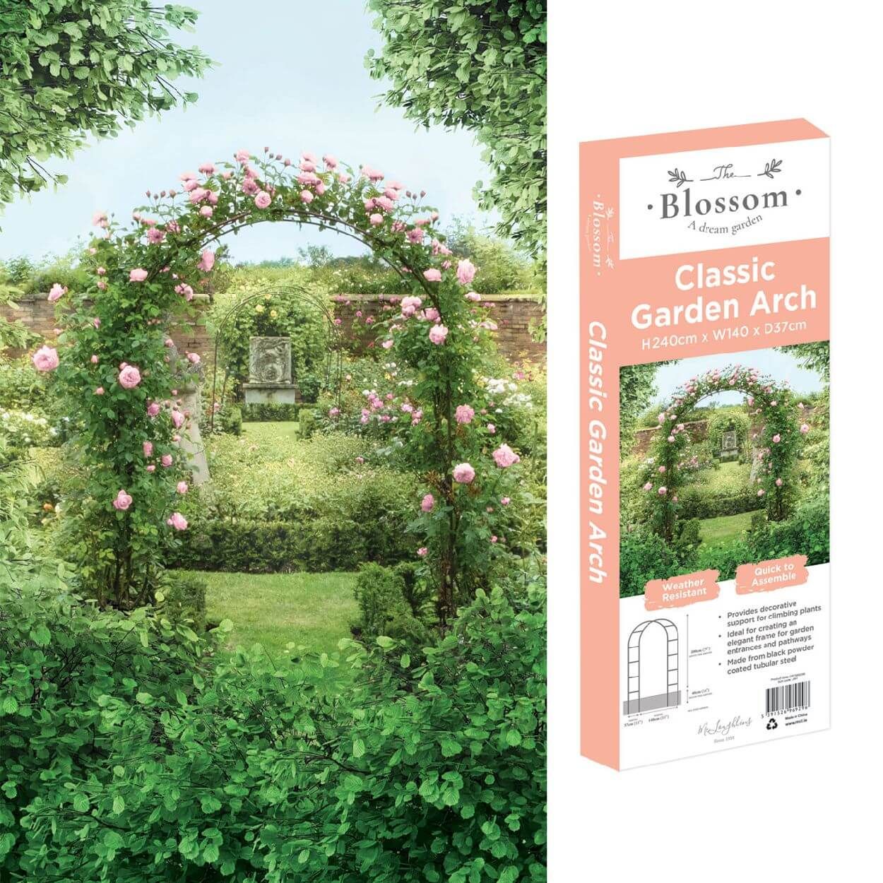 Provides decorative support for climbing plants. Ideal for framing garden entrances and pathways. Made from black powder coated tubular steel. Size H 240 x W 140 x D 37 cm