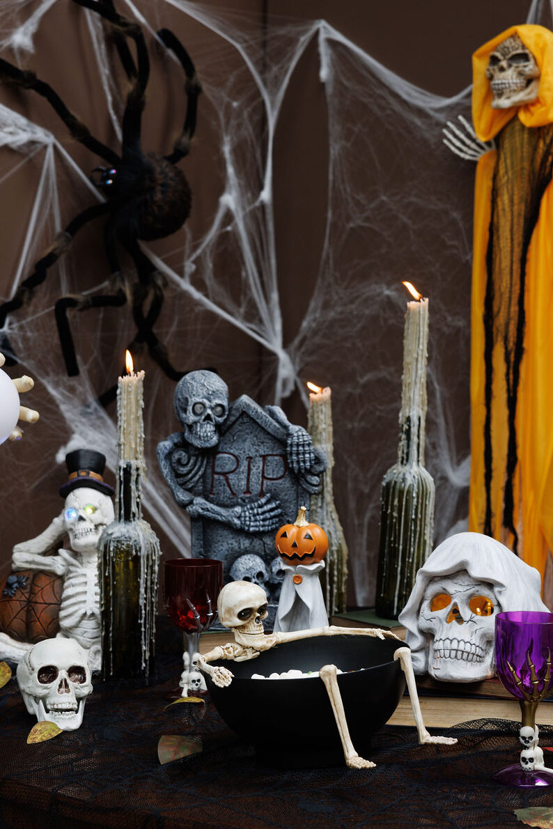 Use a giant lit spider web as the creepy crawler’s home. Afterwards, add plenty of plastic spiders of all sizes. By adding variety, you’ll create the illusion of a family of spiders. After all, what’s scarier than just one spider? The answer: having too many spiders to count!