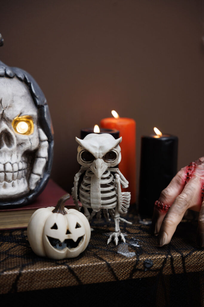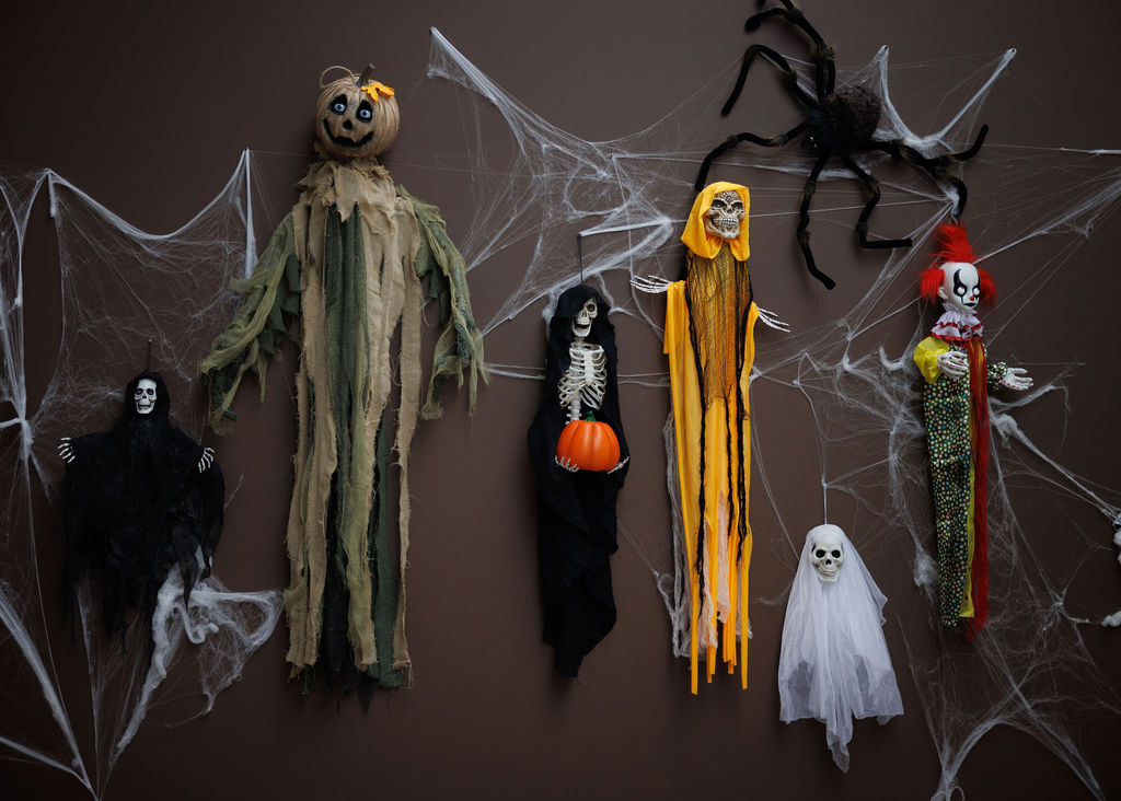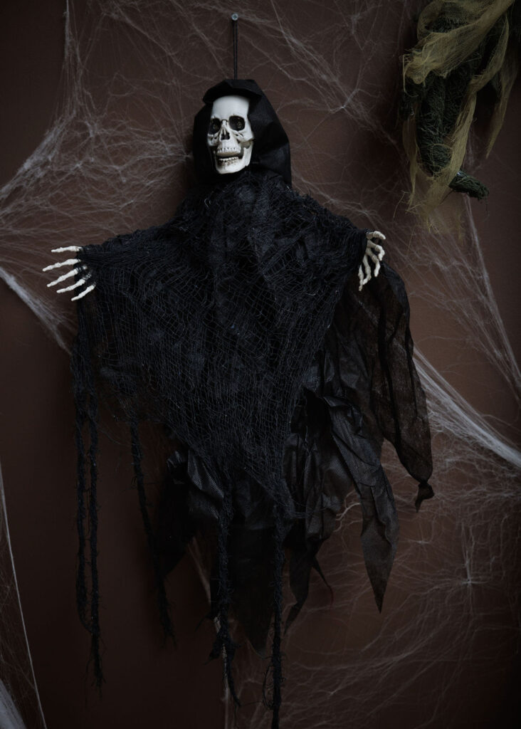 You're not the only one who can wear a costume this Halloween! Dress up your windows with spooky fabric, stickers, cobwebs, and signage to get things started. Then, add in some decorations along the windowsill, like pumpkins, ghosts, witches, or skulls and skeletons to elevate the look. Complete your decorating with an animated floating decoration to give your visitors a peek at who might be lurking inside your haunted house!