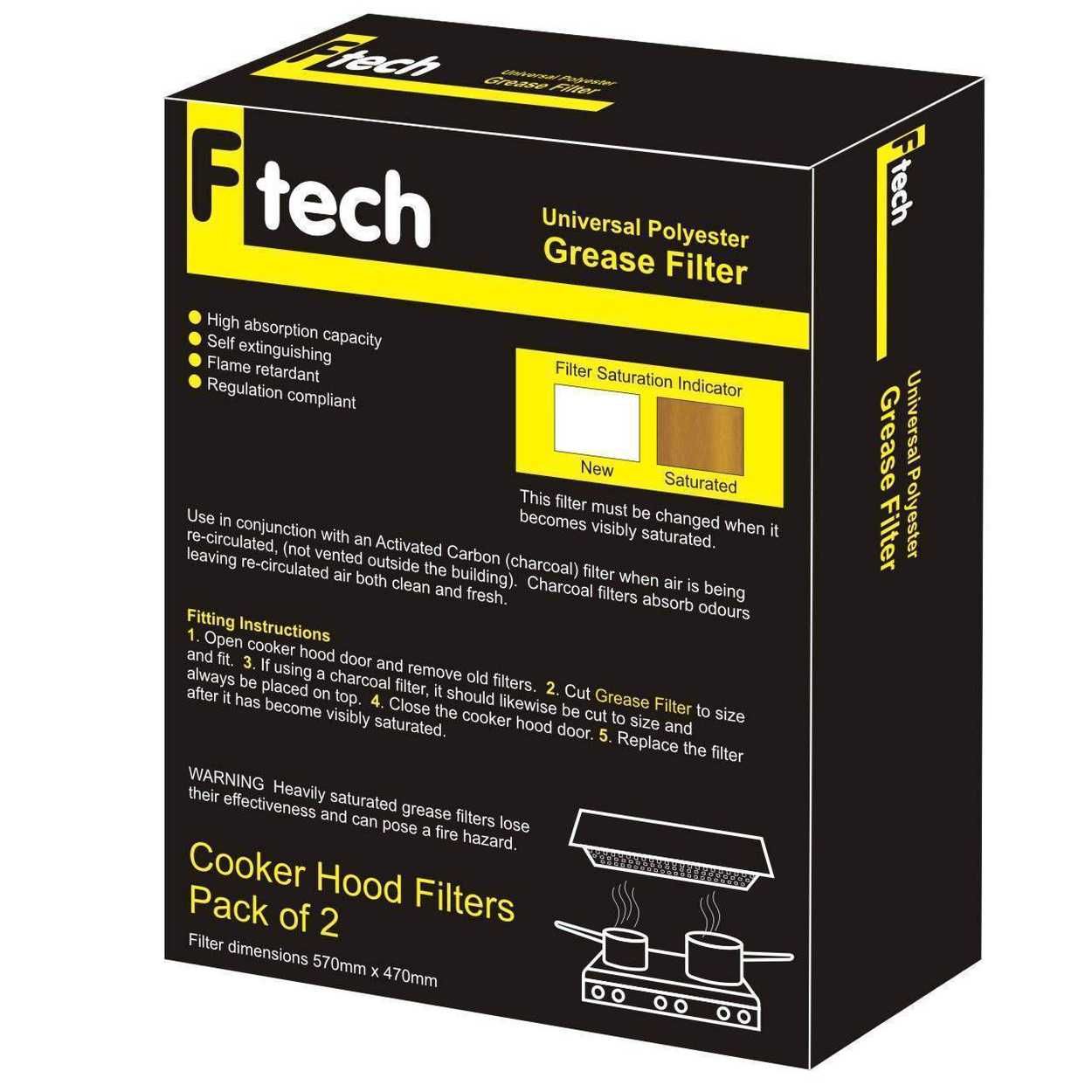The Fiber Tech Yellow Universal Polyester Grease Filter - 2 Pack is suitable for use with most cooker hoods. The filters have a high absorption capacity to capture grease and help keep your cooker and air clean.� When used in conjunction with a charcoal filter, it will help keep your kitchen smelling fresh. It is easy to install and features a saturation indicator to let you know when it needs to be changed. It is also self-extinguishing and flame retardant for safety.� This product is regulation compliant.