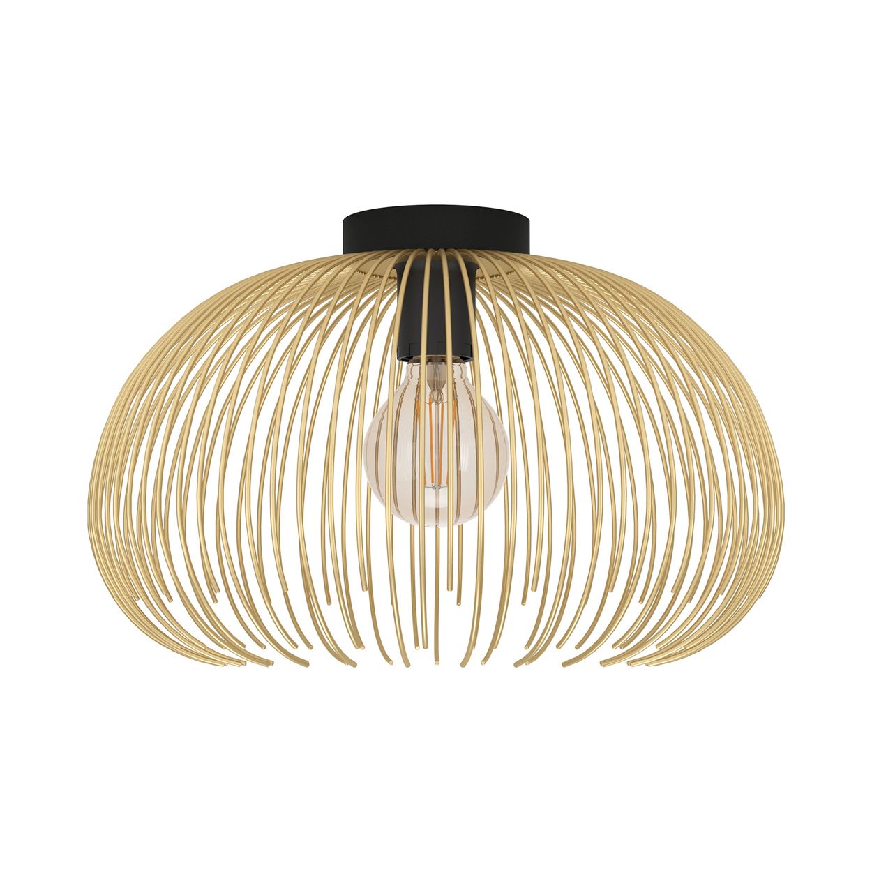 The Venezuela ceiling light has a gold-coloured wire lampshade and a round black metal base. The wire lampshade curves harmoniously around the lightbulb and creates a fascinating play of light and shadow as soon as the light is on. The design complements modern interiors and will provide stylish lighting in any space, whether in the kitchen, living room, bedroom or hallway. The product has an E27 lamp holder and requires 1 x E27 lightbulb, which is not included.
