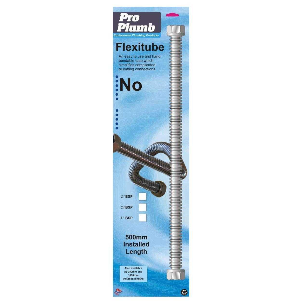 Flexible Hosing - 500mm BSP Long Flexi Tube Connector. An easy to use and hand bendable tube which simplifies complicated plumbing connections. Key Features: No tools needed for bending- Type 304 Stainless Steel. No bore reduction as it bends, Highly flexible. Accepts pressure up to 6 Bar- Three BSP thread sizes. Use for-Tap connections, Awkward radiator connections-Limited access problems, Hot water cylinder connections, Solar heating plumbing. 1000mm Installed Length. Also available in 250mm and 500mm installed lengths.