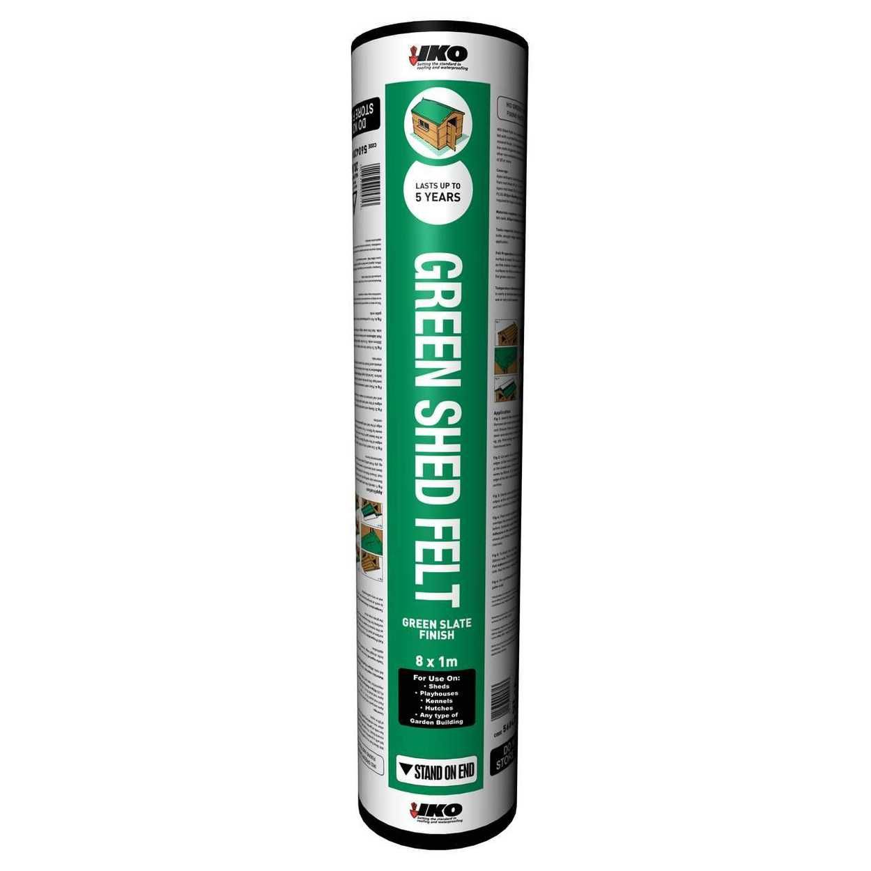 IKO standard shed felt is available in 1m x 8m and is expected to last up to 5 years. Packaging is a green, red or black wrapper with full instructions printed on the wrapper. Traditional style roofing felt. Waterproofs and protects from the elements. Quick and easy to install. Choice of colours.