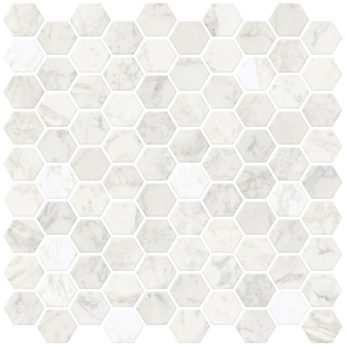 Get the look of an intricate tile backsplash with these peel and stick panels! The small hexagon tiles have the look of classic Carrara marble. Peel and stick tile panels with a high shine finish A stove without a backing needs 15-in of space or more above range to avoid exposure of product to heat.