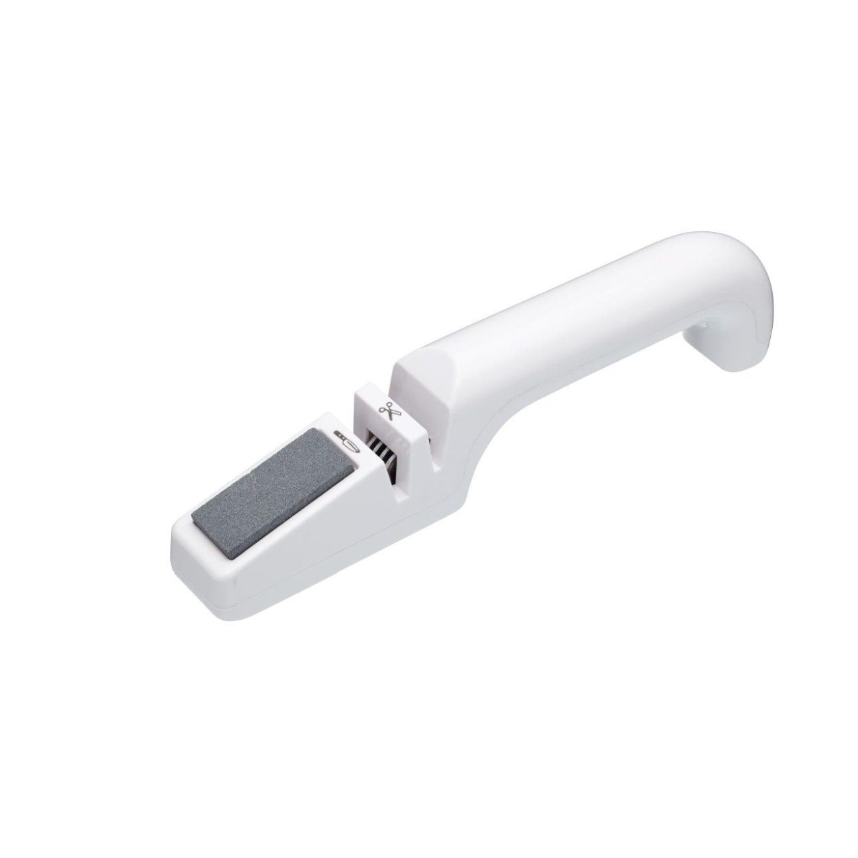 Double slot sharpener for sharpening all types of non-serrated edged knives, pen knives and scissors. Features a grind stone for extra sharpness and an easy to grip handle.