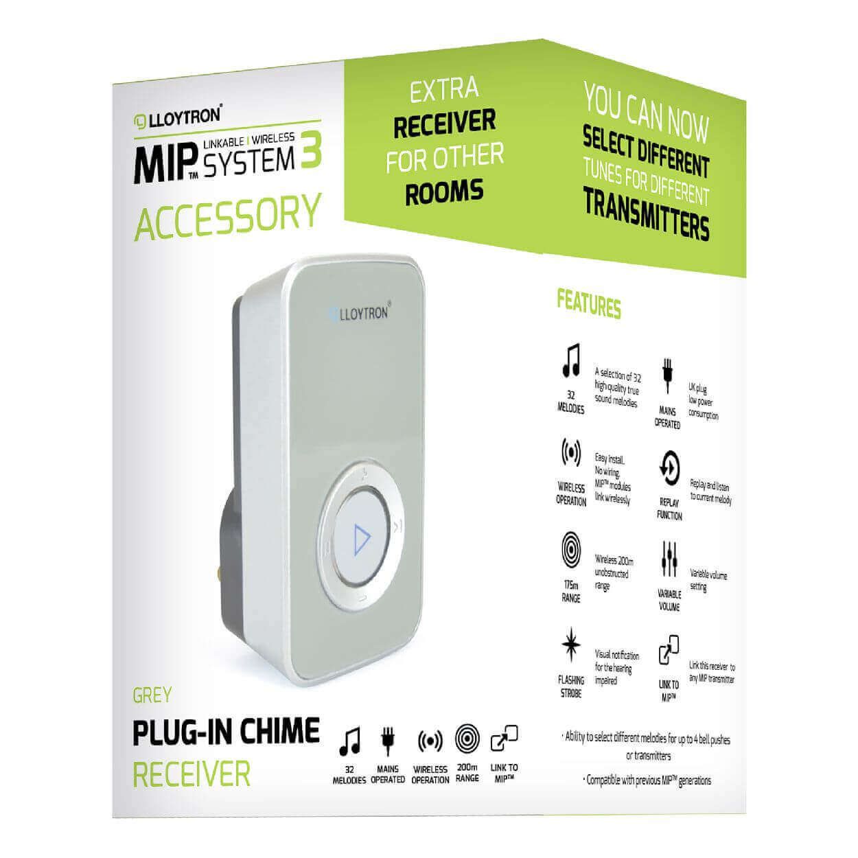 75623Lloytron 32 Melody Plug-In Chime Receiver Greyhttps://www.woodies.ie/media/catalog/product/cache/cf1890990df95d31ec3f71ca794d499e/d/b/db7935gr.jpg118082122.99EURInStock/DIY & Building Materials/DIY & Building Materials/Doors & Door Accessories/DIY & Building Materials/Doors & Door Accessories/Door Bells & Chimes/First Woodie’s Shop as a Homemaker32 MELEODY DOOR CHIME LONG RANGE EASY DIY PLUG AND PLAY VOLUME CONTROL FLASHING STROBE INDICATOR falsetrueSimpleProduct