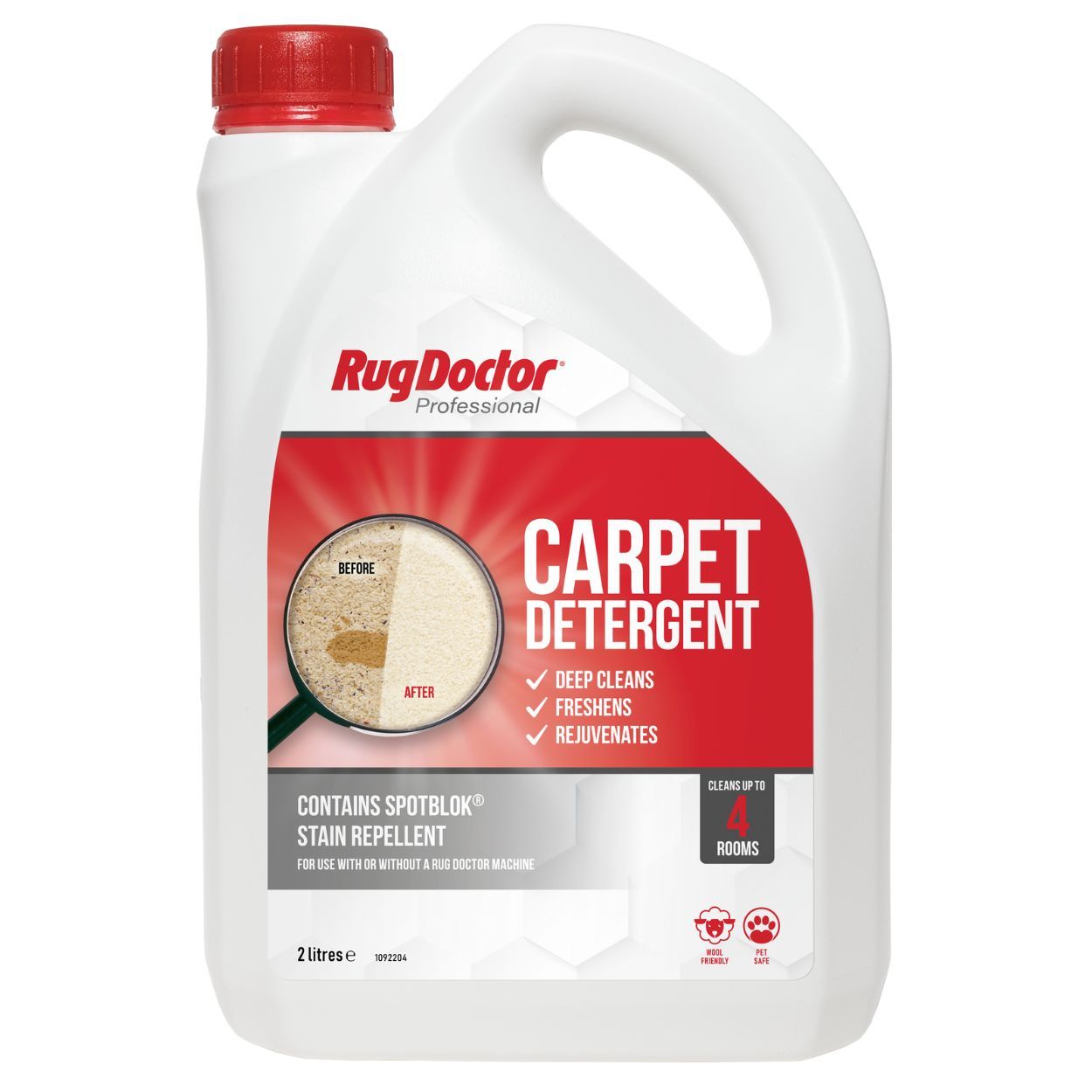 The rug doctor carpet detergent is for use in all deep cleaning and hot water extraction carpet cleaners. Cleans, beautifies, deodorises and protects your carpet. Deep cleans up to twice the area of other brands. For best results, pre treat heavily-soiled areas with Rug Doctor High Foot Traffic Cleaner. Cleans, deodorises, protects and rejuvenates. Contains SpotBlok. 2 litres Clean approximately 800sq ft/75m2 (4 rooms).