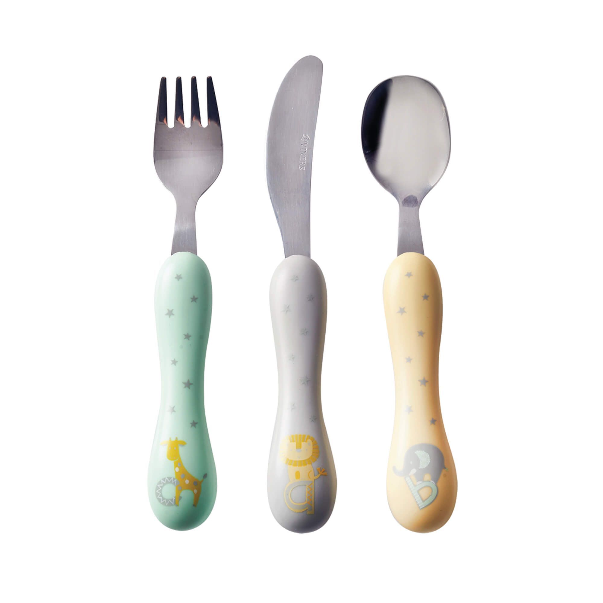 This 3 piece cutlery set is ideal for your little ones. The set features coloured handles that fit perfectly in toddler hands. They also feature textured backs which make the cutlery easier to grip. This fun, interactive and colourful colourful set is ideal for breakfast, lunch and dinner.